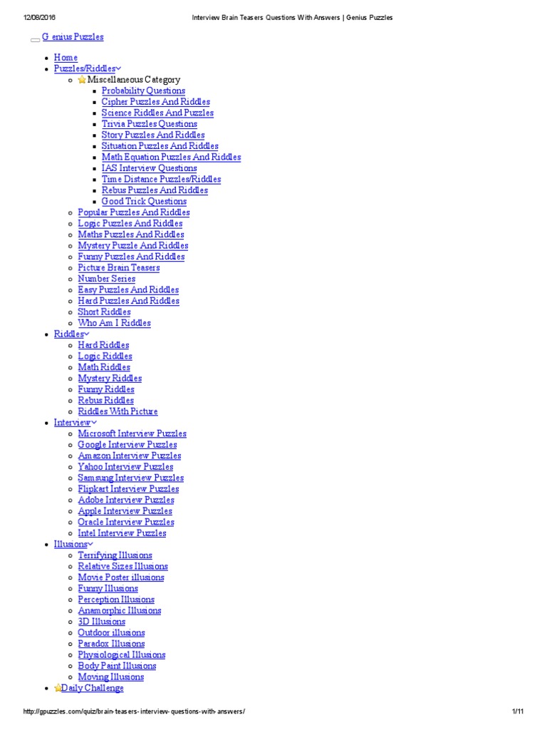 Top 25 Tech Interview Puzzles With Answers Puzzle Fry from puzzlefry.com Logical puzzles interview questions and answers for software companies, mba exams and all type of exams. Best site to read puzzles. This problem is also called jelly beans problem. They are not in any specific order. At this page, you will get 159+ brain teaser puzzles questions with answers for your interviews and entrance exams. Logic questions for interview purposes can be used to assess these skillsets as well as gauge the way you ask for information, use resources and work under pressure. These forms of questions are a riddle that you are expected to answer. 169 = 55 x 3 + 4.